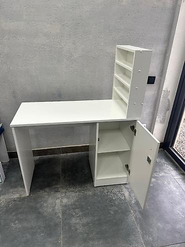 - Стол мастера белого цвета с вертикальным модулем-органайзером.