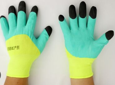 - Перчатки с полимерным покрытием ладони и пальцев. Основа — дышащий трикотаж салатового/бирюзового цвета, кончики пальцев усилены черным нескользящим слоем для уверенного хвата мелких и гладких предметов. Удобны для монтажа, работы с инструментом, в саду и на складе.