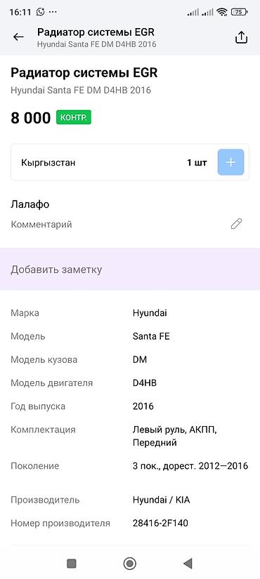 Радиатор системы рециркуляции отработавших газов (EGR) для автомобилей Hyundai Santa FE DM с двигателем D4HB, выпущенных в 2016 году. Данная деталь, произведенная Hyundai/KIA, имеет номер производителя 28416-2F140. Он предназначен для снижения выбросов оксидов азота путем возврата части выхлопных газов обратно в камеру сгорания.