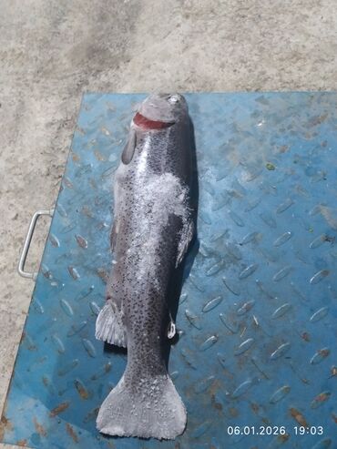 Форель радужная, потрошёная, неразделанная с головой и хвостом. Цельная тушка с характерной серебристо-серой шкурой и тёмными пятнами.