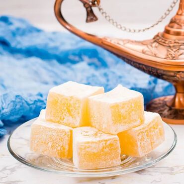 - Восточные сладости в классических сахарных кубиках, присыпанные пудрой для нежной текстуры.