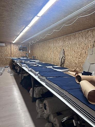 - Модульный раскройный стол промышленного типа, несколько секций, общая длина — для раскладки длинных настилов ткани.