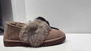 Теплые мокасины для женщин, выполненные из мягкой замши или похожего текстурированного материала в светло-коричневом или сером цвете. Внутри они отделаны пушистым материалом, обеспечивающим комфорт...