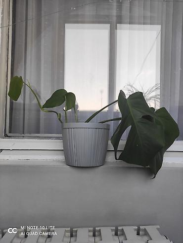 Оба растения в пластиковых горшках: хлорофитум — тёмный, монстера — серый фактурный. Просты в уходе и подходят начинающим.
