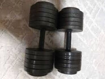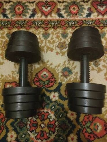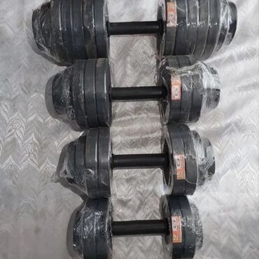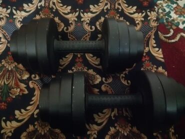 Пара разборных гантелей черного цвета. Диски зафиксированы на грифе с помощью пластиковых гаек. Поверхность дисков обернута в прозрачную пленку. Удобны для домашних тренировок и поддержания физичес...