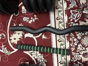 - Рукояти: одна прямая (с черно-зеленой неопреновой накладкой для хвата), одна изогнутая EZ-форма для удобного хвата при упражнениях на бицепс и трицепс.