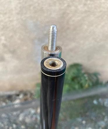 - Двухсоставной кий с резьбовым соединением: металлический шпигот и втулка для надежной стыковки.