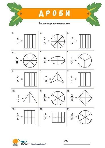 - Рабочий лист с 15 заданиями на раскрашивание долей: круги, прямоугольники, треугольники и ромбы, поделённые на равные части. Упражнения тренируют понимание записи и сравнения дробей (например, 4/7, 2/8, 1/3, 5/6, 6/6 и др.), связь с целым и визуализацию долей.