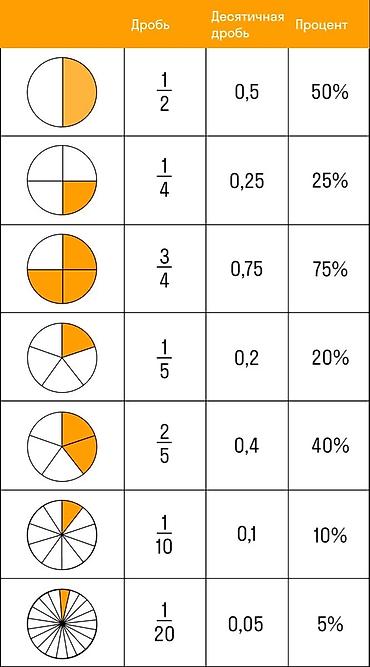 - Памятка-таблица «Дробь — десятичная — процент»: наглядные соответствия для типовых дробей (1/2, 1/4, 3/4, 1/5, 2/5, 1/10, 1/20) с окрашенными секторами круга и перевodom в десятичную форму и проценты (0,5 = 50%, 0,25 = 25% и т. п.).
