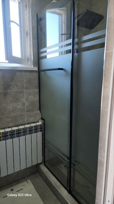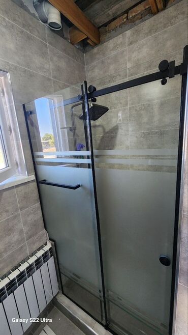 Раздвижная перегородка для душевой/ниши - Конструкция: три секции из матового закалённого стекла, центральная створка — раздвижная. - Профиль и фурнитура: чёрный металл, верхняя направляющая с рол...