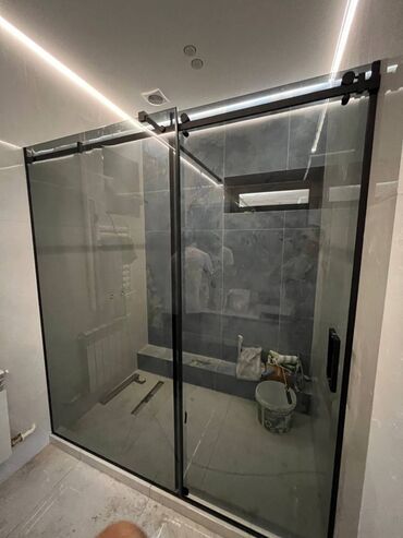 Душевая перегородка со сдвижными дверями из закалённого стекла. -