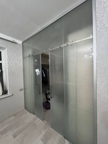 Раздвижная душевая перегородка из закалённого стекла с матово‑чёрной фурнитурой - Конструкция: двухстворчатые раздвижные двери на верхней направляющей с роликами; фиксированная боковая створка. - ...