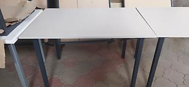 - Столешница: светлая, гладкая, из ЛДСП/МДФ (визуально ламинированная), состоит из двух частей с продольным разрезом — предусмотрено раздвижение/вставка для увеличения площади.