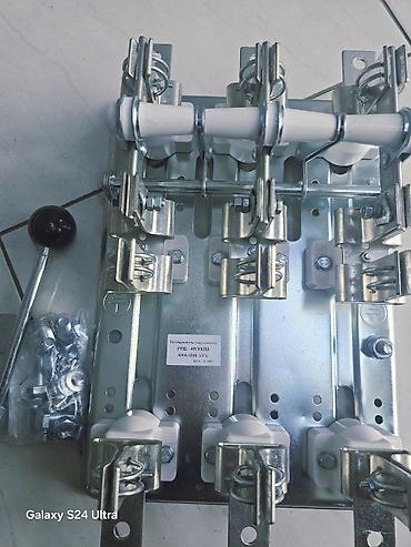 - Конструкция: металлическое основание с цинковым покрытием, клеммные зажимы под плавкие вставки, ручной привод с рукояткой, ось и тягами; фарфоровые/керамические изоляторы.