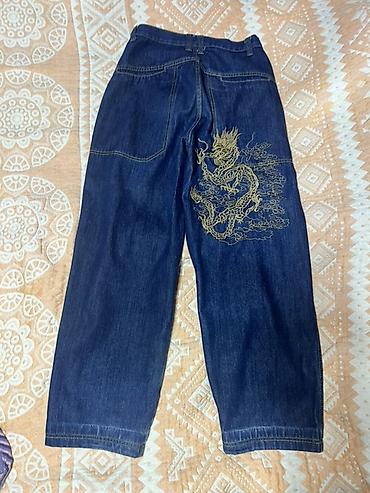 Джинсы из плотного тёмно‑синего денима с широким прямым кроем. Спереди — классическая застёжка на пуговицу и молнию, боковые швы со строчкой контрастными нитками. Сзади — две вместительные накладные карманы и эффектная вышивка золотистыми нитями: крупный восточный дракон, расположенный на правой стороне от бедра до колена. Пояс со шлёвками под ремень. Длина до щиколотки, свободная посадка по бедру и колену. Яркий акцент за счёт декоративной вышивки — под уличные и кэжуал образы.