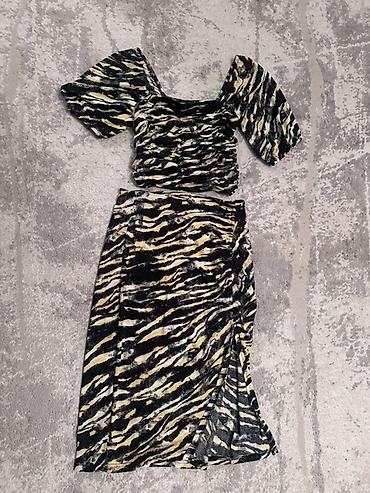- Принт расположен одинаково на топе и юбке для цельного образа.