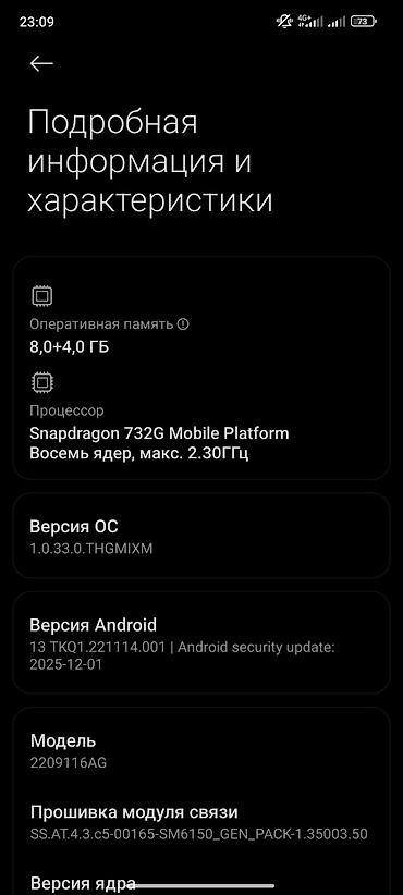 - Интерфейсы и связь: 4G, Wi‑Fi, Bluetooth; прошивка модуля связи SS.AT.4.3.c5-00165-SM6150_GEN_PACK-1.35003.50.