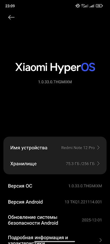 Смартфон Redmi Note 12 Pro, синий. Ключевые характеристики: - Память: 256 ГБ (доступно ~47,4 ГБ занято из 256 ГБ на скриншоте). - ОС: Android 13, версия прошивки MIUI 1.0.28.0 (THGMIXM). - Безопас...