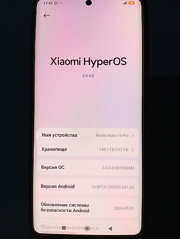 Смартфон Redmi Note 14 Pro, ОС Xiaomi HyperOS 3.0.4.0 на базе Android (версия системы безопасности от 2026‑02‑01). Память: 512 ГБ, доступно около 145,7 ГБ занято/свободно по состоянию на скриншоте. Цвет корпуса – черный.оперативный память 12.