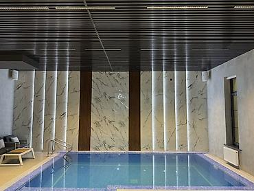 - Алюминиевые реечные панели: ровная геометрия, устойчивость к влаге и перепадам температуры, подходят для жилых и коммерческих помещений, бассейнов, спа, офисов, торговых залов и холлов.