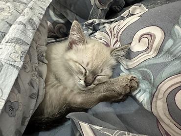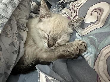Котёнок с серебристым окрасом поинт (светлая шерсть с затемнениями на ушках, хвосте и лапах). Большие ушки, пушистый хвост, мягкая густая шерсть. Спокойный, ласковый характер: любит спать, сворачиваться калачиком под одеялом и мурлыкать рядом с человеком. Подходит для квартиры, дружелюбен, ориентирован на общение, быстро привыкает к новому месту.
