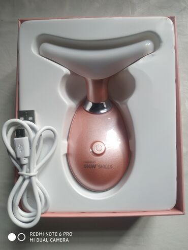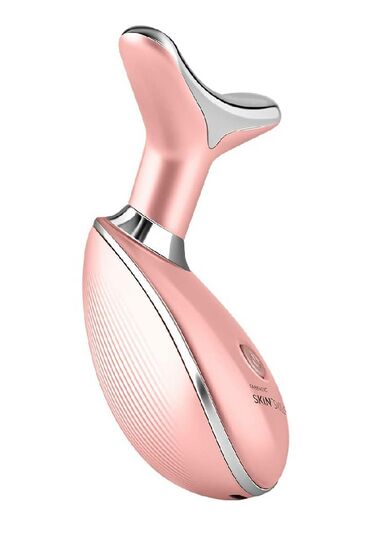 Массажер для омоложения шеи и лица имеет уникальную V-форму для моделирования контуров лица и шеи, миостимуляции и очистки кожи. Сочетает действие положительных и отрицательных ионов, высокочастотной вибрации, световое (светодиоды красного, синего и зеленого спектра) и тепловое воздействие.
