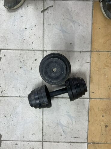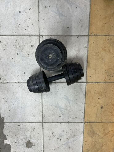Комплект на фото: одна гантель с несколькими сменными блинами. Размер и точный вес блинов не указаны на изображениях.