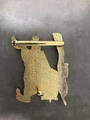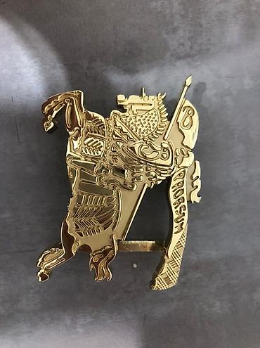 - Пряжка: крупная металлическая, золотистого цвета, фигурная — всадник на коне с флагом и рельефными деталями; надпись «Prorsum» на ленте флага.