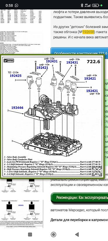 - восстановление и замена соленоидов: TCC 2.5 Ω (№ 192425), модулирующий и регуляторы давления/переключений 4–5 Ω (№ 192421, 192431 и др.)