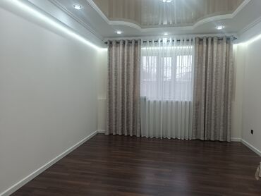- Просторная гостиная с натяжным потолком сложной формы, точечными светильниками и скрытой LED‑подсветкой по периметру. На окне — двойной комплект текстиля: полупрозрачные тюли и плотные шторы на люверсах.