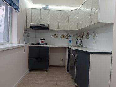 - Отдельная кухня: угловой гарнитур с глянцевыми фасадами, верхние и нижние шкафы, вытяжка, газовая варочная поверхность на 2 конфорки, мойка, рабочая столешница, розетки над фартуком. Стеновой фартук из плитки с кофейным декором. На окне рулонная штора.