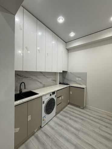 - Кухня: линейный гарнитур до потолка, глянцевые фасады, столешница и фартук под мрамор, индукционная/газовая варочная панель с 4 конфорками, мойка с черным смесителем, места под встраиваемую технику. Встроена стиральная машина.