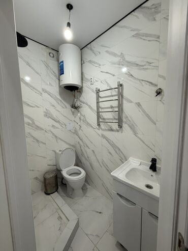 - Санузел: облицовка плиткой под мрамор, подвесной полотенцесушитель, тумба с умывальником и смесителем, унитаз, душевая зона в уровне пола, установлен электрический водонагреватель.