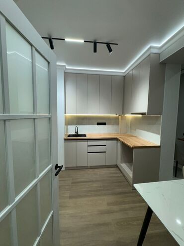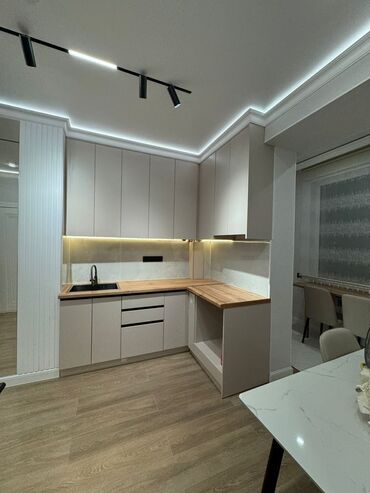 • Кухня с матовыми фасадами, подсветкой рабочей зоны, местом под встраиваемую технику