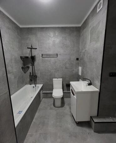 - Отдельный санузел в плитке «под бетон».
