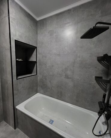- Ванна стандартная, ниша в стене для хранения, тропический и ручной душ, полка‑уголок.