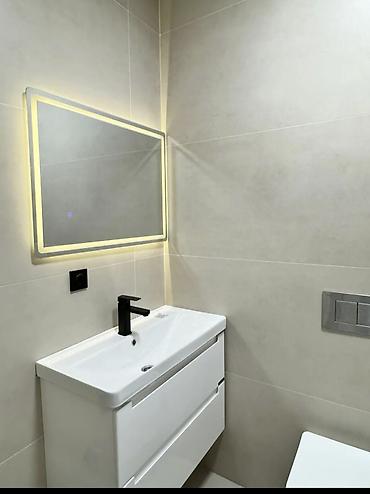 - Санузел: крупноформатная керамогранитная плитка на стенах и полу, подвесной унитаз с инсталляцией и скрытой кнопкой, акриловая ванна с нишами для хранения, чёрный комплект смесителей и душ, тёплый свет зеркала с подсветкой, подвесная тумба с умывальником, потолочный светильник и вентиляция.