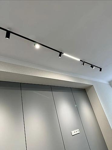 - Коридор: ровные стены и потолок с тонкими теневыми примыканиями, встроенный линейный свет, настенный светильник, скрытые плинтусы, чёрная фурнитура, высокий белый шкаф-гардероб. Двери в едином стиле, магнитные замки.