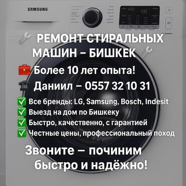 Предлагаю услуги по ремонту стиральных машин всех марок, включая LG, Samsung, Indesit, Bosch и другие. Выезд на дом в Бишкеке. Оперативное и качественное обслуживание с гарантией. Опыт работы более 10 лет.