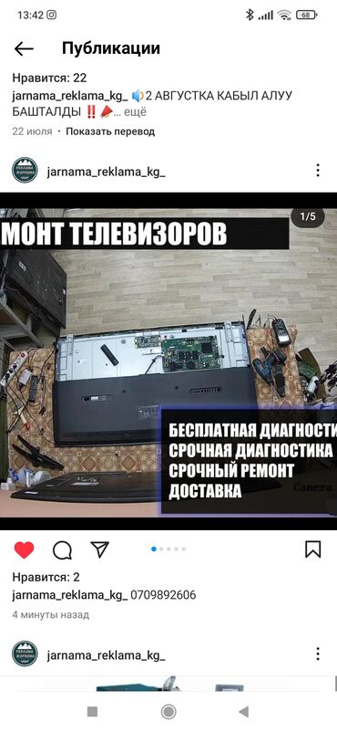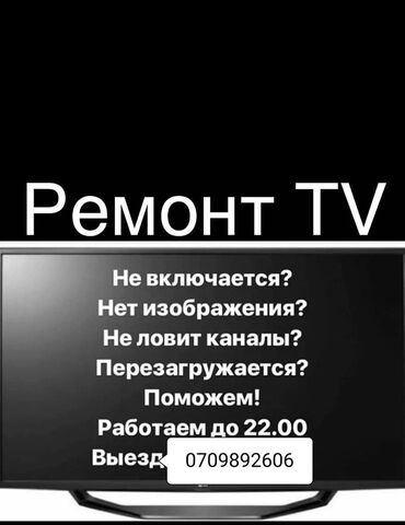 Услуги телемастера с выездом по городу! Широкий сервис, все виды ремонта. Гарантия на заменённые запчасти. Ремонтируем все типы телевизоров Шаар боюнча ремонт тв Чалгыла звоните...