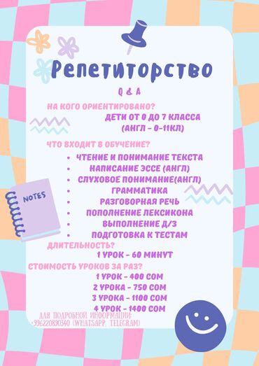 • Индивидуальные занятия • Скидка 50% на первое посещение • Подход к каждому ребенку ( я по второму образованию психолог) • Есть ОНЛАЙН-занятия • Занятия проходят в с.Новопокровка • 500 сом в час