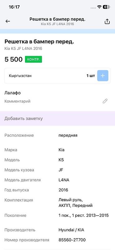 - Подходит для: Kia K5 JF (1‑е поколение, рестайлинг 2013–2015/2016 указывается по ВИН и мотору L4NA)