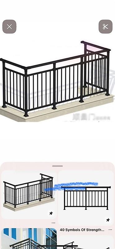 - Конструкция: вертикальные стойки и горизонтальный поручень; варианты с прямыми вертикальными прутьями или с декоративными коваными вставками по центру/по бокам.