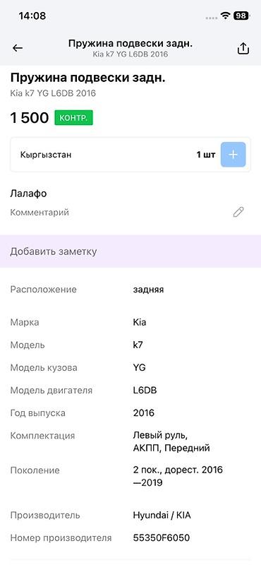 Подходит для установки на заднюю ось. На фото – пружина со штатными изоляторами/чашками. Цена по изображению: 1500 (валюта как на скриншоте). Страна: Кыргызстан.