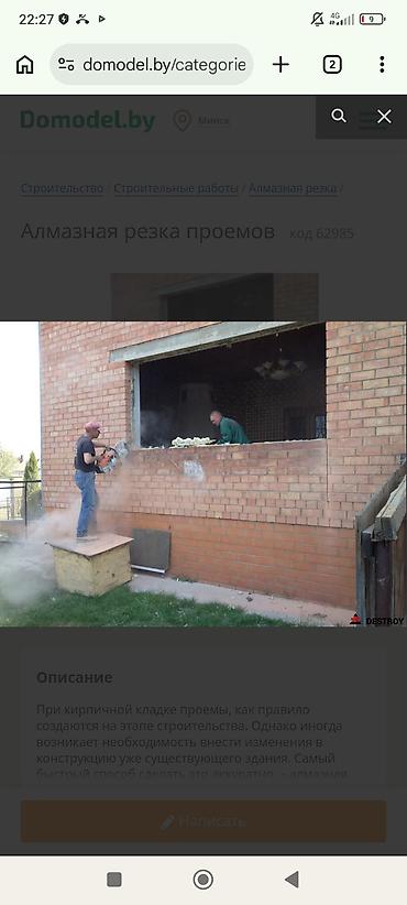 Алмазная резка проемов, стен и перекрытий. - Резка бетона, железобетона, кирпича и пеноблоков - Устройство дверных и оконных проемов по проекту/разметке - Точная геометрия кромок, минимальная вибр...