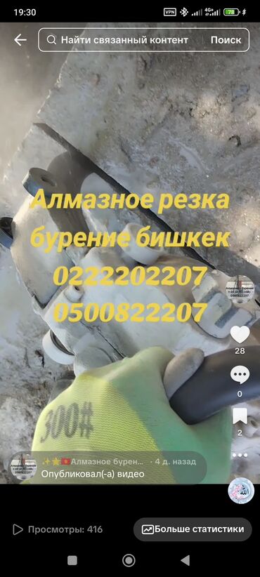 🔧 Алмаздуу кесүү кызматтары 📍 Бишкек жана облусу боюнча ✅ Буроо: диаметрлер 32 ммден 300 ммге чейин ✅ Дубал кесүү: калыңдыгы 15 ммден 600 ммге чейин ✅ Электр, суу, желдетүү үчүн так тешиктер ✅ Дуб...