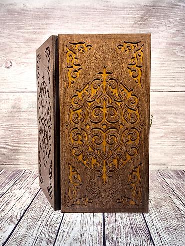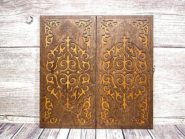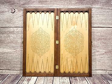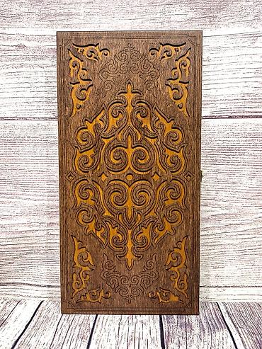 - Материал: натуральное дерево, крышка с глубоким художественным резным орнаментом, внутренняя игровая поверхность из светлой породы с гравированным узором.
