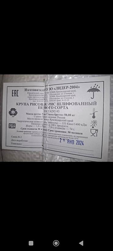 Продам рис шлифованный белый «Уштобинский». Цена 50 сом за кг, цена договорная. - Белый шлифованный круглозёрный рис. - Происхождение: Казахстан (на упаковке — «Сделано в Казахстане», ТОО «Уштоби...