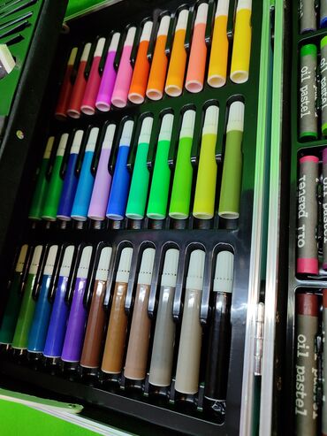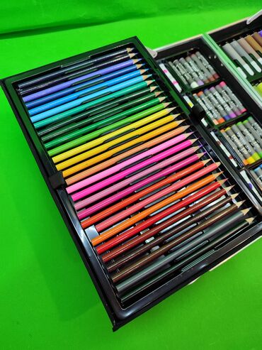 Комплектация товара: 27 карандашей, 2 простых карандаша, 4 кисточки, 2 палитры, 24 акварелевых краски, 24 водяных краски в тюбиках, 24 пастеля, 2 точилки и резинка, 33 толстых фломастера✅