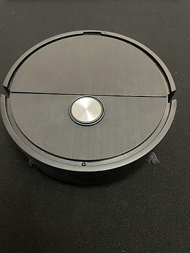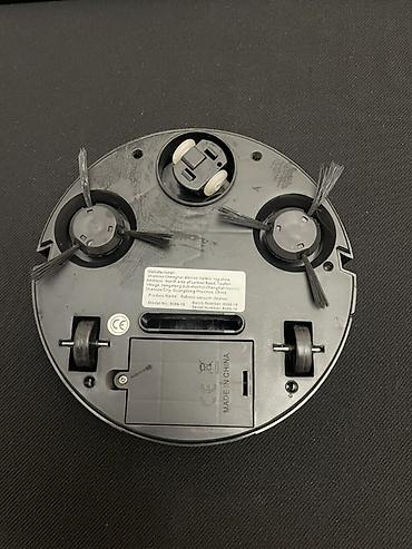 Робот-пылесос круглой формы, компактный, с верхней крышкой и центральной кнопкой управления. На нижней части установлены три боковые щетки для эффективного подметания мусора вдоль стен и в углах, опорные колеса и переднее поворотное колесо для маневренности. Предусмотрен отсек для элементов питания и съемный контейнер для мусора. Конструкция подходит для сухой уборки гладких покрытий: ламинат, плитка, паркет, линолеум, низкий ковер.